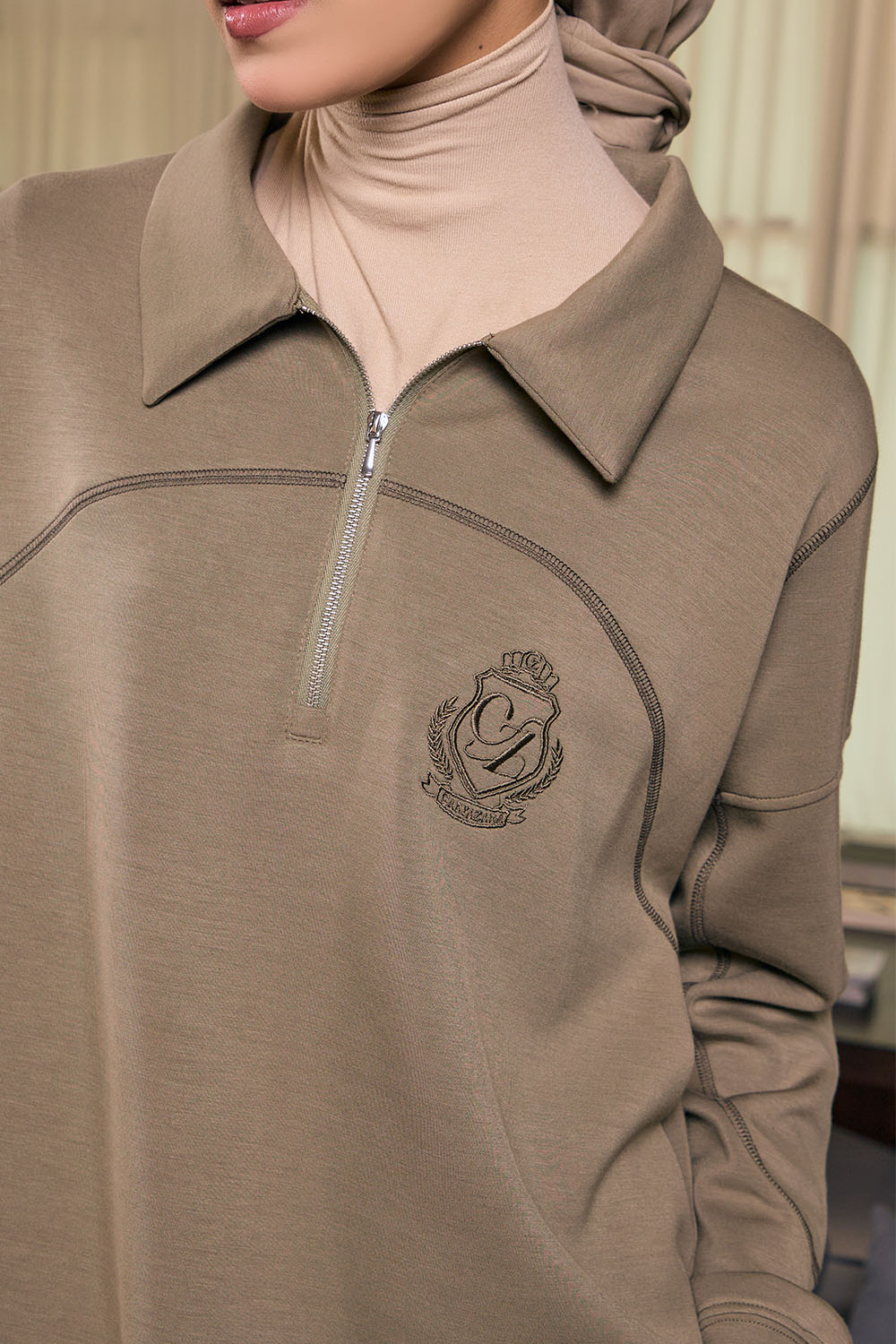 • Half zipper collar for a modern, sporty look